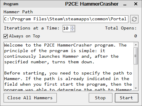 On April 1st, the creators of Portal 2 Community Edition decided to make achievements for the Hammer and several achievements required you to crash the program a lot of times. I, for fun, decided to make a program that does this itself.